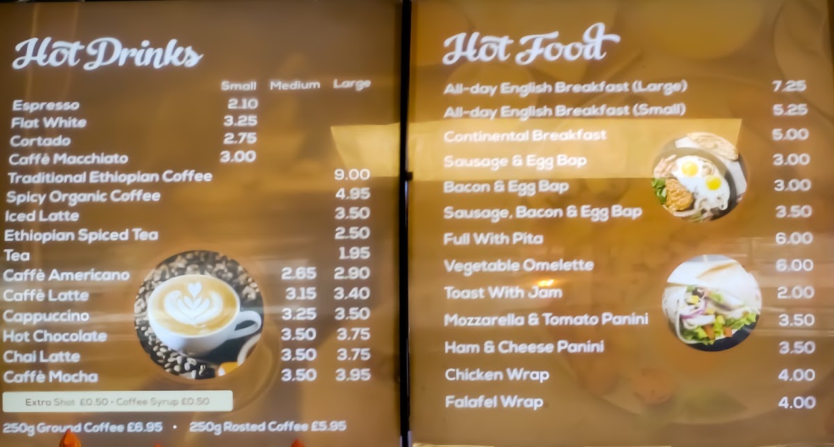 The culinary offerings do not stop at beverages. Ethiopian Organic Coffee serves an array of delightful food items, perfect for breakfast or a quick bite. Start your day with an All-Day English Breakfast, bursting with flavor, or opt for a Continental Breakfast if you prefer something lighter. The hearty Sausage and Egg Bap or delicious Vegetable Omelette are sure to hit the spot, while the Mozzarella & Tomato Panini offers a fresh, satisfying option for lunch. Customers rave about the massive Chicken Wrap, making it a standout choice—just ask Sharif Furkan, who declared it a must-try!